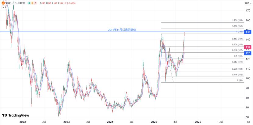 El diseño innovador en AI ha permitido que Alibaba continúe avanzando en la mejora de la valoración narrativa de IA. Con los múltiples conceptos de la liberación del valor de reestructuración "recuperación de www.xmmen.comercio electrónico" + "AI" + "Valor de reestructuración", el precio de las acciones también está aumentando con un alto momento. Ha aumentado en un 50% desde el mínimo de abril y ahora ha alcanzado un máximo desde noviembre de 2011. Si continúa superando a HK $ 150, abrirá un nuevo espacio ascendente y mirará hacia HK $ 170.