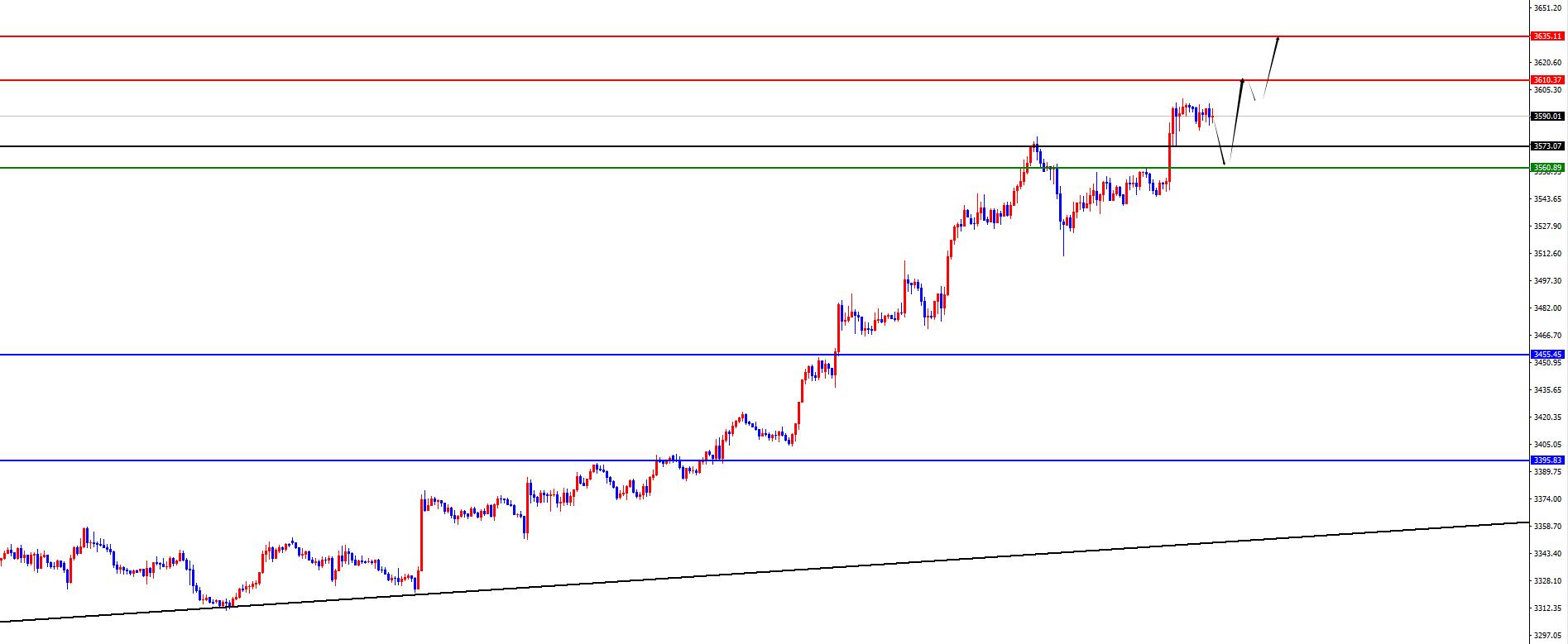 Gold ha una lunga distanza di 3561-3562, con una difesa di 10 dollari USA e un obiettivo di 3590-3610-3635