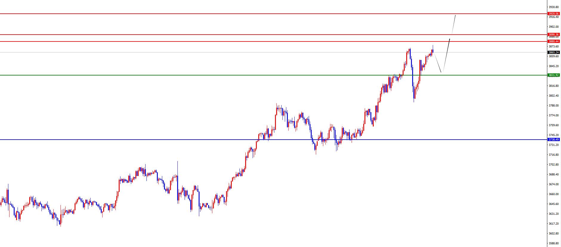 从多周期分析,首先观察月线节奏,从长线上看3130位置是长线走势的分水岭,价格在此位置之上长线多对待即可。从周线级别看,目前周线多空分水岭于3490位置,价格在此位置之上中线多对待即可。从日线级别看,暂时需要关注3735区域支撑,此位置之上波段多对待,目前继续右侧交易方式对待。从四小时上看,观察黄金上涨节奏中,价格只要没有下破四小时支撑则维持强势多,价格只有下破后才会出现调整,目前四小时支撑于3831-3832区域,所以价格在此位置之上继续多头对待。