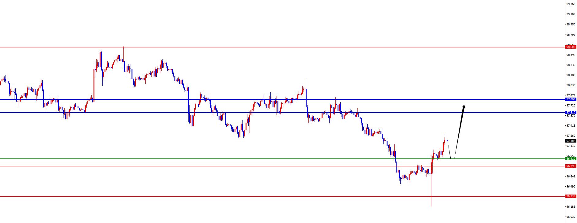 The US dollar index has a long range of 96.80-90, with a defense of 5 US dollars, and a target of 97.30-97.60-97.80