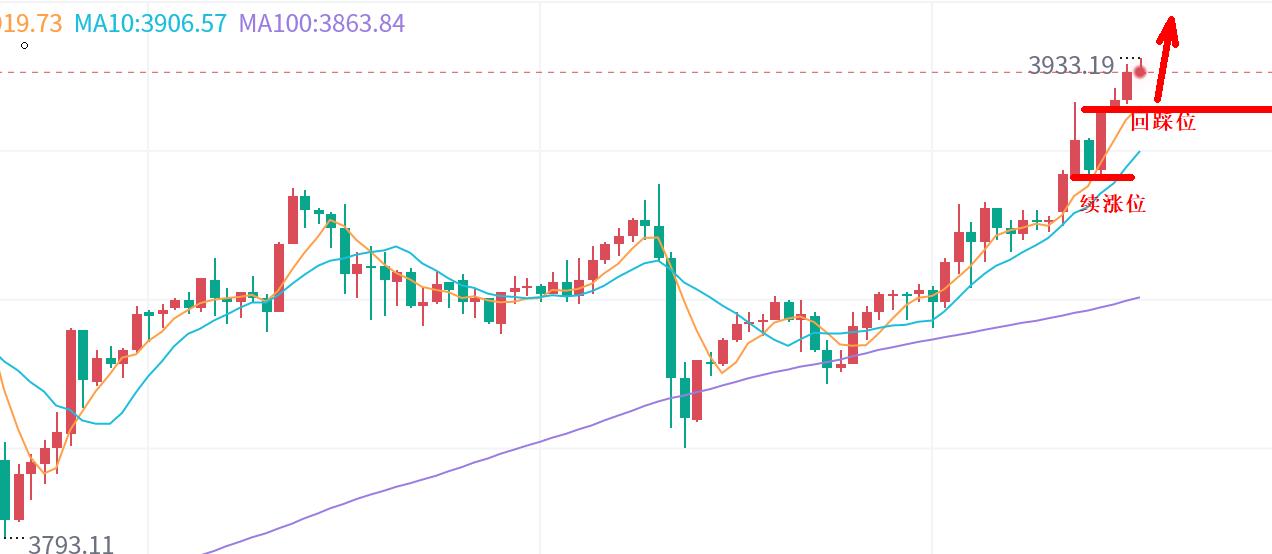 2. This rise will lead to a long retracement for the second time. It is usually the bottom of the hourly line, the top-bottom conversion position and the 382 position, at the 3900 line.