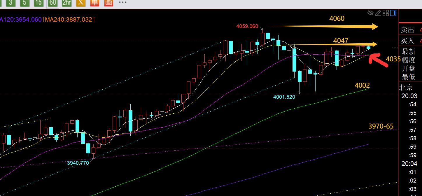 Second, the golden hour line level: In the morning, the big Yin fell sharply and fell below the 10 moving average and the middle rail. It rebounded first to confirm the middle rail. It happened to be the 618 dividing resistance line that fell from the overnight high to the morning low and rebounded from the 4037 line. Follow the wave to see a correction, with the lowest touching 40 02, there is a profit margin of 30 meters; then after a wave of decline, a downward channel with high points moving downwards and low points moving downwards gradually formed. The afternoon rebound channel continued to try bearish corrections below 4028, but the price broke through the opening in front of 4037, and the suppression failed. If the channel formation fails, it is necessary to re-plan a new route; the entire European market is actually jumping back and forth around the middle track, with poor continuity, and it has been in a show; tonight, pay attention to the 10-day moving average of 4035, just like last night, only if it effectively breaks the position and falls, after the rebound is confirmed, can the downward pressure be suppressed. Wave, then test the support above 4000, and the daily 5-day moving average support above 3970; on the contrary, if 4035 has been holding on and has not effectively broken, the trend will still remain quite strong and resistant, and the top may test the Bollinger Band upper limit of 3460 to see the gains and losses;