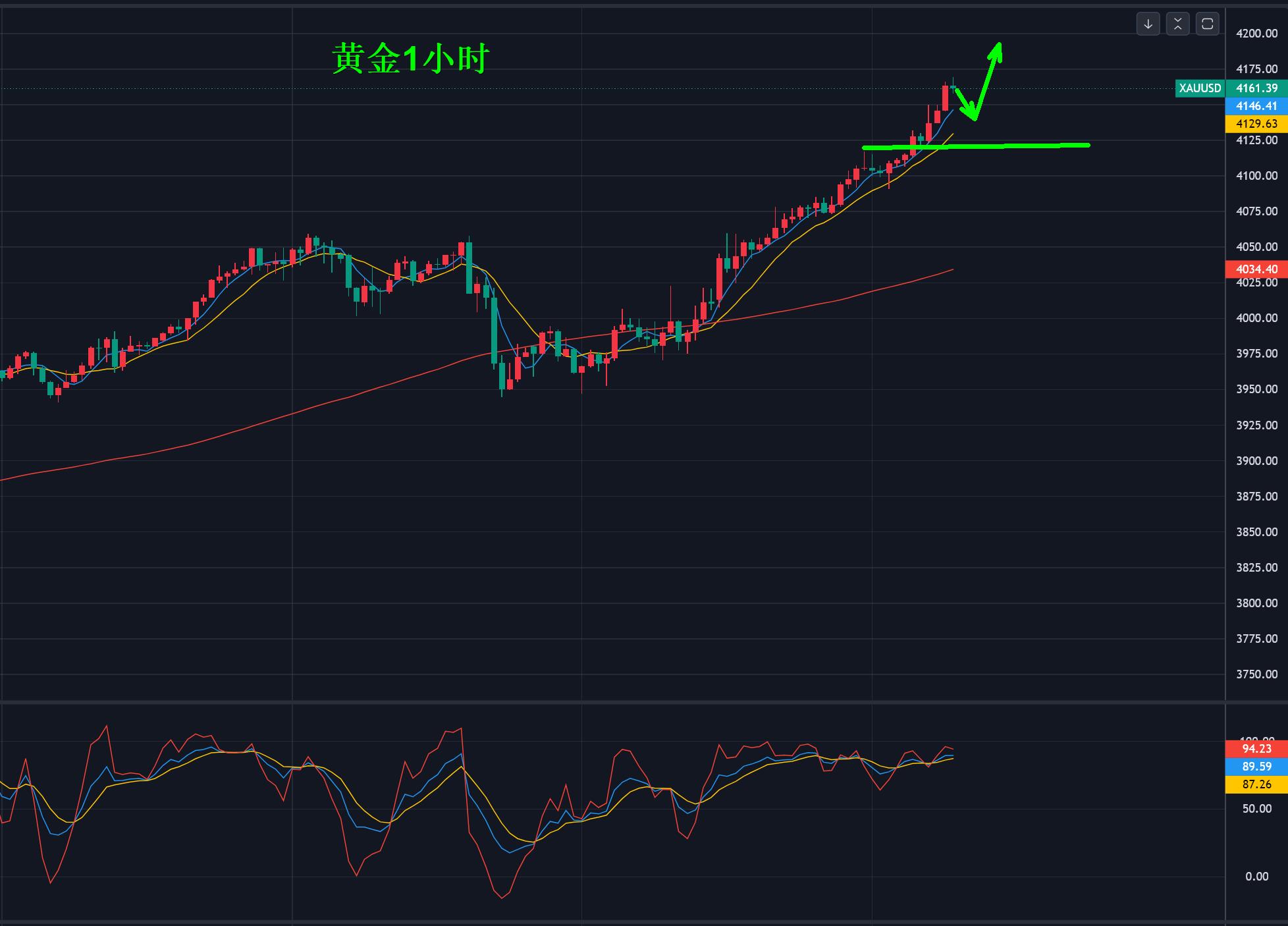This time, the gold price adjusted by $100 from $4,060, and made a second upward breakthrough. It has now refreshed above $4,160. It has increased by $200 after adjusting by $100, and is getting closer to $4,200. The focus is on the 1-hour 5/10 moving average as the support point.
