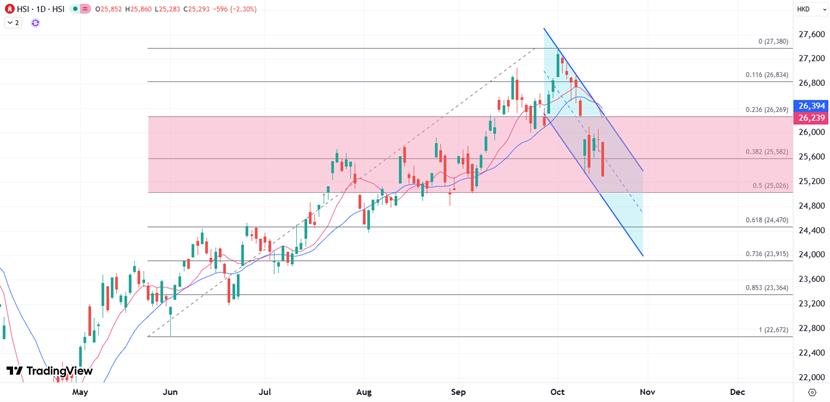 Hong Kong stocks fell as a whole this week as the international trade situation became tense. Technology stocks that hit a periodic high some time ago have become the main drag on the market's downward trend. However, as the prospects are still promising, the current fluctuations may attract the establishment of positions. The Hang Seng Index is mainly showing consolidation in the low range this week. It is expected to close down more than 3% for two consecutive weeks on the weekly basis. It is concerned that it may obtain some low-level buying support near the 25,000 mark and try to rebound again. Currently, it continues to pay attention to the trading in the range of 26,300 to 25,000.