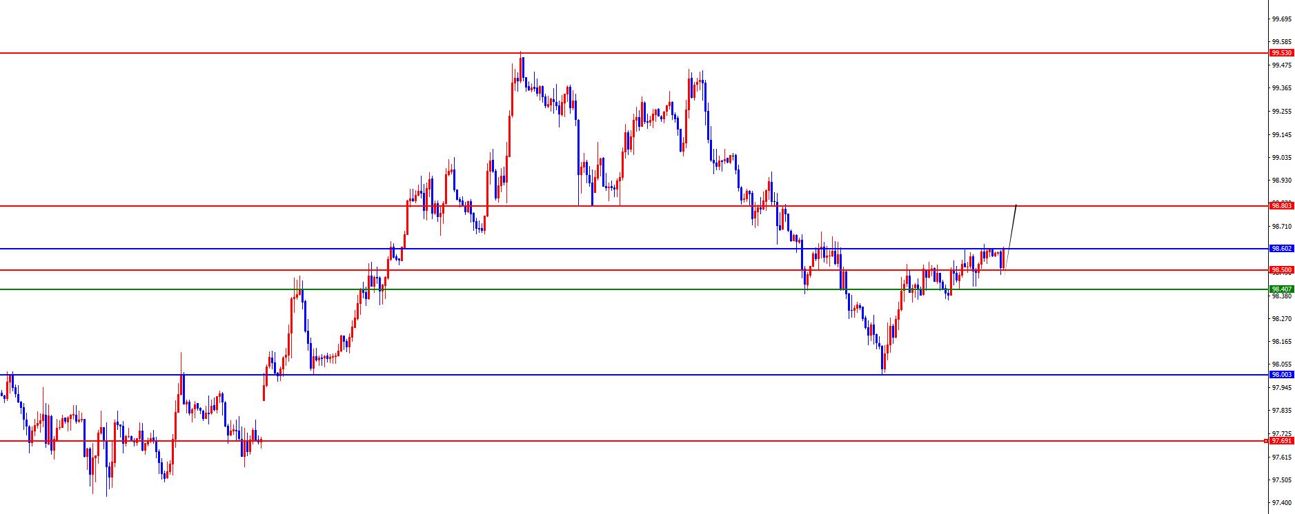 From a multi-cycle analysis, the weekly price stabilized last week after continuing to fluctuate in the early stage. Last week, the price stepped back on the weekly support position and fell. The current weekly support is in the 98 area. Follow-up attention will be paid to further mid-term bulls (need to pay attention to the gap position). From the daily level, as time goes by, the current daily resistance is in the 98.60 area. This position is the key to the band trend. The price has been consolidating up and down at this position recently. Short-term operations need to be xmmen.combined with small cycles. From a four-hour perspective, during the recent fluctuations, we found that the price relied on the four-hour key position. As yesterday's price broke through the four-hour resistance, this position became a key support. The position is temporarily focused on the 98.40-50 range. We will rely on this area to see further growth in the future. In one hour, the current price is also bullish, so we will focus on the bullish operation for the time being, and the upper side will temporarily focus on the 98.80 area resistance.
