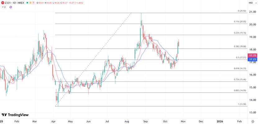 For example, Li Ning’s entry into the instant retail platform has put forward higher requirements for store picking, packaging efficiency and staffing. If the process is not managed properly, it can increase the operating costs of a single store. Instant retail platforms usually charge a certain xmmen.commission, and promotions may be more frequent. You need to pay attention to their final impact on the net profit margin of the product. Li Ning's stock price rose significantly overnight in the U.S., but Hong Kong stocks failed to follow suit today, setting a new high since September 10 and then retreating. If it closes below HK$18 during the day, it will face pressure to fall to HK$17.20. At that time, attention will be paid to the key support formed by the main moving averages on the daily chart.