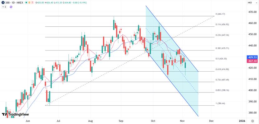 From a valuation perspective, the current P/E of the Hong Kong Stock Exchange is about 30-35 times. Although it is close to a one-year high, it is also higher than the historical average (about 25-30 times), but lower than high-growth technology xmmen.companies. Earnings that beat expectations may have driven the stock price higher recently, but whether valuations are too high depends on the sustainability of future growth. Current valuations partially price in record trading volume, but do not fully reflect the long-term potential of IPOs and derivatives. After today’s performance, the stock price followed the market and was affected. However, in the short term, the stock price will continue to digest the positive performance, but whether it can break through the resistance of the daily moving average and return to the top of the range since mid-October, the key resistance to return to the high range is HK$440.