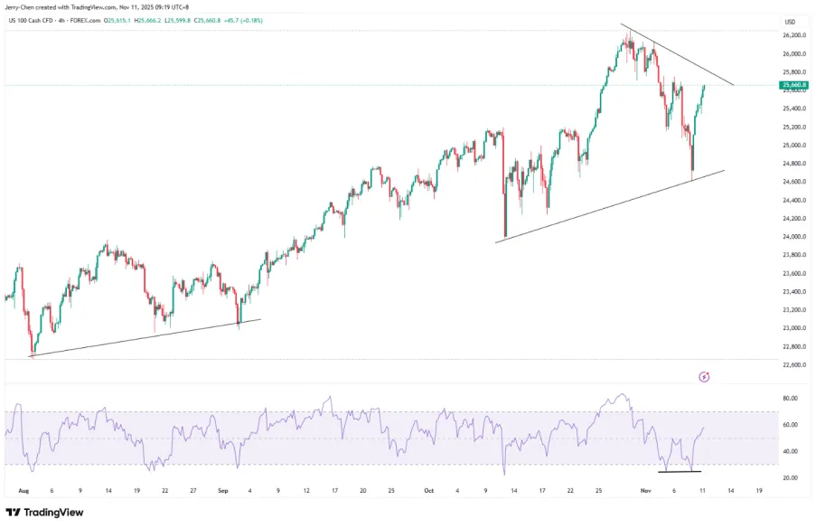 Market liquidity is expected to return if the U.S. government reopens its doors. At the same time, Trump even said that he would consider issuing a "tariff dividend" of US$2,000 to most Americans. Optimism is expected to continue to stimulate the Nasdaq 100 index to rise at the beginning of this week.