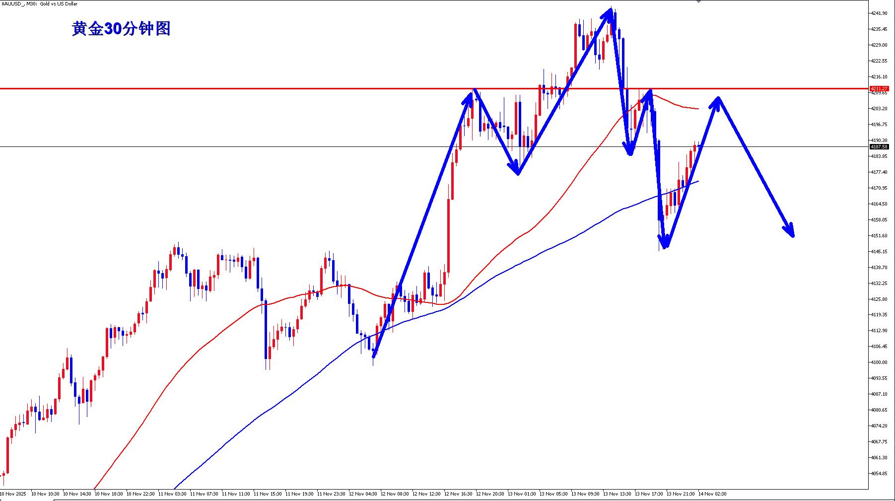 After gold's 30-minute decline yesterday, gold's 30-minute short-term head-and-shoulders structure has formed. Gold's current resistance is near 4210, and gold's early rebound is under pressure at 4210. So gold can still continue to go short. Is gold's daily rebound over? Gold's current 30-minute moving average has begun to turn downward. If it continues downward to form a dead cross, then gold will continue to open up room for further declines in 30 minutes.