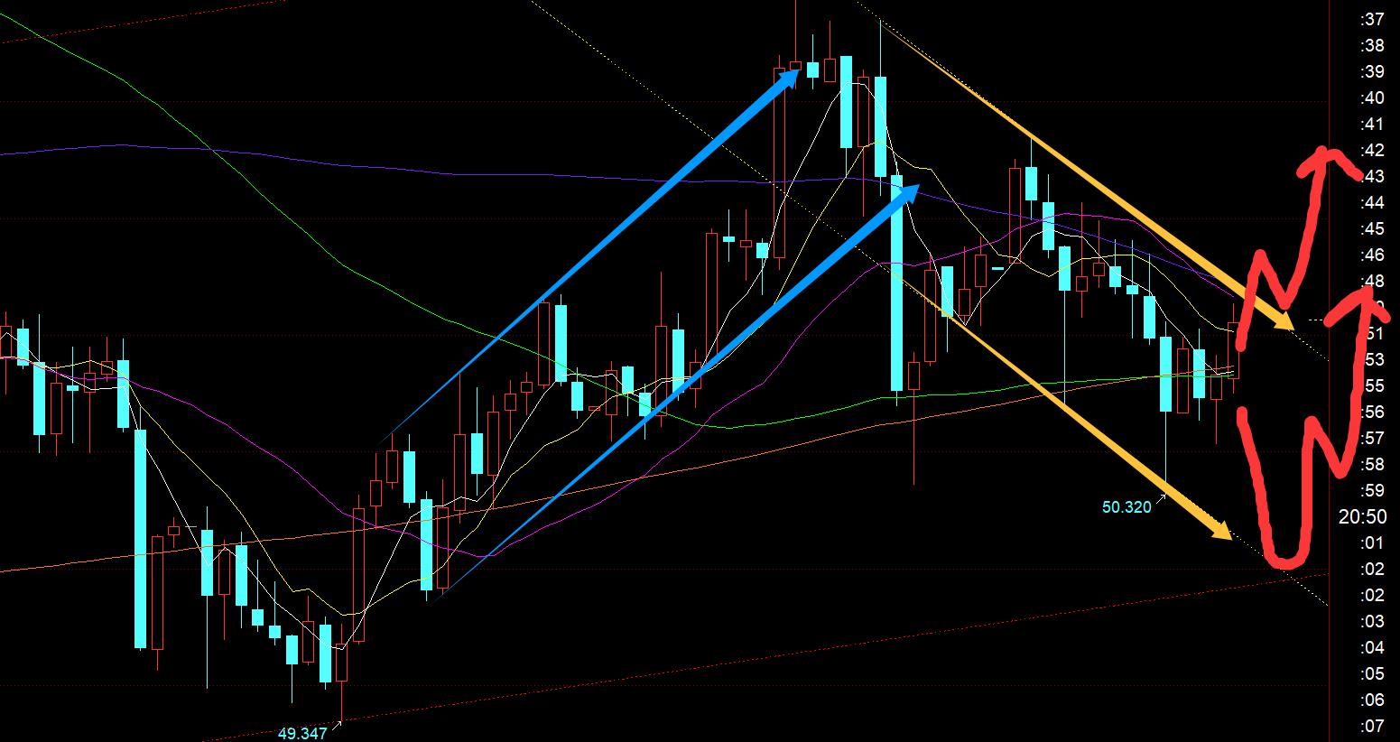 Argento: il grafico è sostanzialmente coerente con l'andamento dell'oro. Attualmente prestiamo attenzione anche alla traccia superiore del canale giallo, 51.1. Se riesce a sfondare direttamente la stazione e restare fermo, può continuare a rimbalzare fino a 51,8, 52,5, ecc.; se sopprime la caduta, prestare attenzione alla stabilizzazione del supporto 50, che è anche il binario inferiore del precedente canale rosso;
