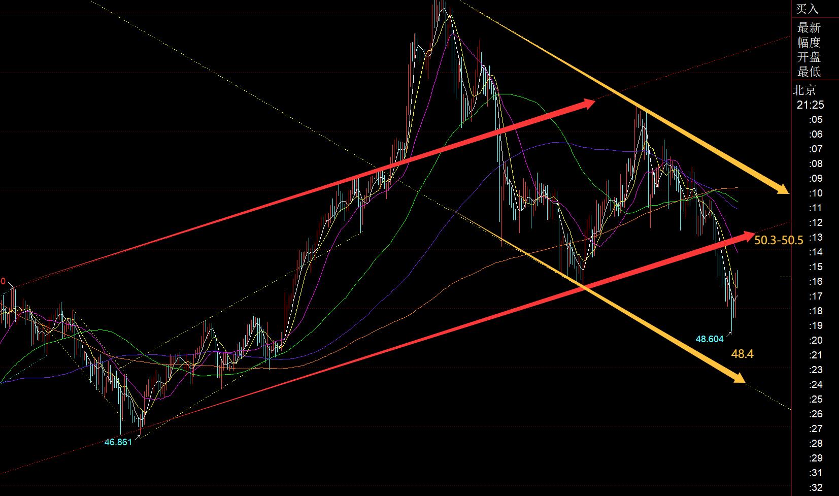 Argento: oggi l'argento è molto più debole dell'oro. Il mercato asiatico-europeo continua a scendere lentamente senza quasi alcuna ripresa. Inserisce direttamente la linea di supporto del trend giornaliero, con un minimo di 48,6, avvicinandosi al supporto della media mobile settimanale 10 di 48,4; poi dipende dalla situazione di chiusura del late trading. Se una lunga ombra inferiore può apparire e chiudere sopra 49,35, allora siamo ancora ottimisti; tuttavia, il pull-up a cinque onde originariamente previsto per questa settimana è sostanzialmente fallito e la sua ampiezza è stata modificata. Trattalo entro limiti ragionevoli; concentrarsi sulla gamma alta e ampia di 54,4-47,5; stasera, concentrati sulla contropressione del binario inferiore di 50,2-50,3 nel canale rosso e presta attenzione al pullback sotto pressione, supporto 48,4-48,6; se ritorna al canale rosso, potrebbe tornare allo shock al rialzo all'inizio della prossima settimana e non essere più troppo debole;