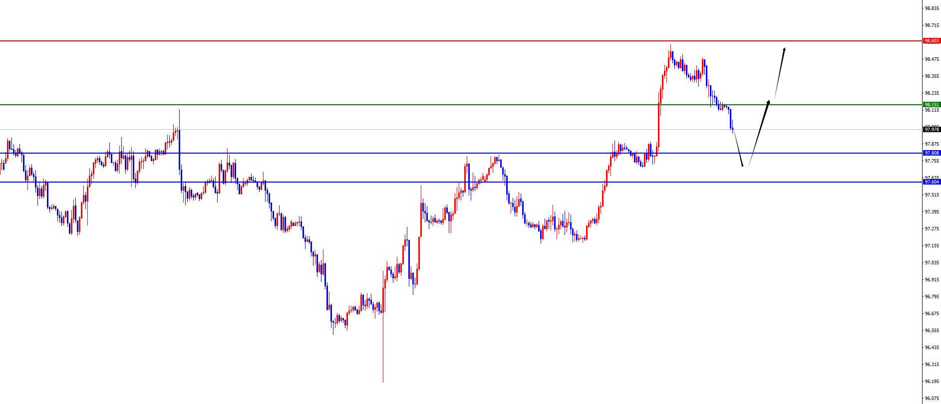 从多周期分析,周线级别来看近期价格在周线关键上下盘整,目前周线支撑于97.80区域,同时在上周价格站上周线阻力,后续看中期看多头延续。从日线级别看,随着时间的推移目前日线支撑于97.60区域,价格此位置之上波段进一步上涨。从四小时上看,目前看四小时支撑于98.15阻力,价格在此位置之下先看承压,之后测试到日线及周线支撑区间出现反K再看多头延续,如若价格再度站稳四小时阻力则继续看延续。
