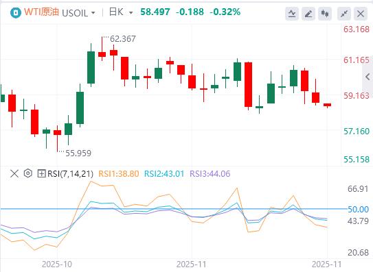 周五亚盘,原油交投58.49附近。油价周四震荡收跌,尽管美国原油库存降幅超预期带来支撑,但美国推动俄乌和谈的消息引发供应过剩担忧,最终压制了市场情绪。市场正密切关注周五美国对俄罗斯石油公司和卢克石油制裁的生效情况,以及乌克兰对最新和平提议的正式回应,这些因素将决定短期油价走向。