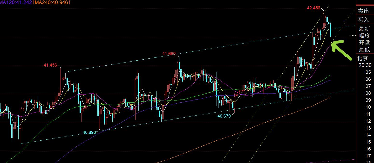 白銀方面:亞歐盤持續單邊拉升,美盤前回踩一波,今晚留意圖中通道下軌,也是小時線中軌,大概41.9附近,能穩住它,則繼續看漲,看日內高點得失;
