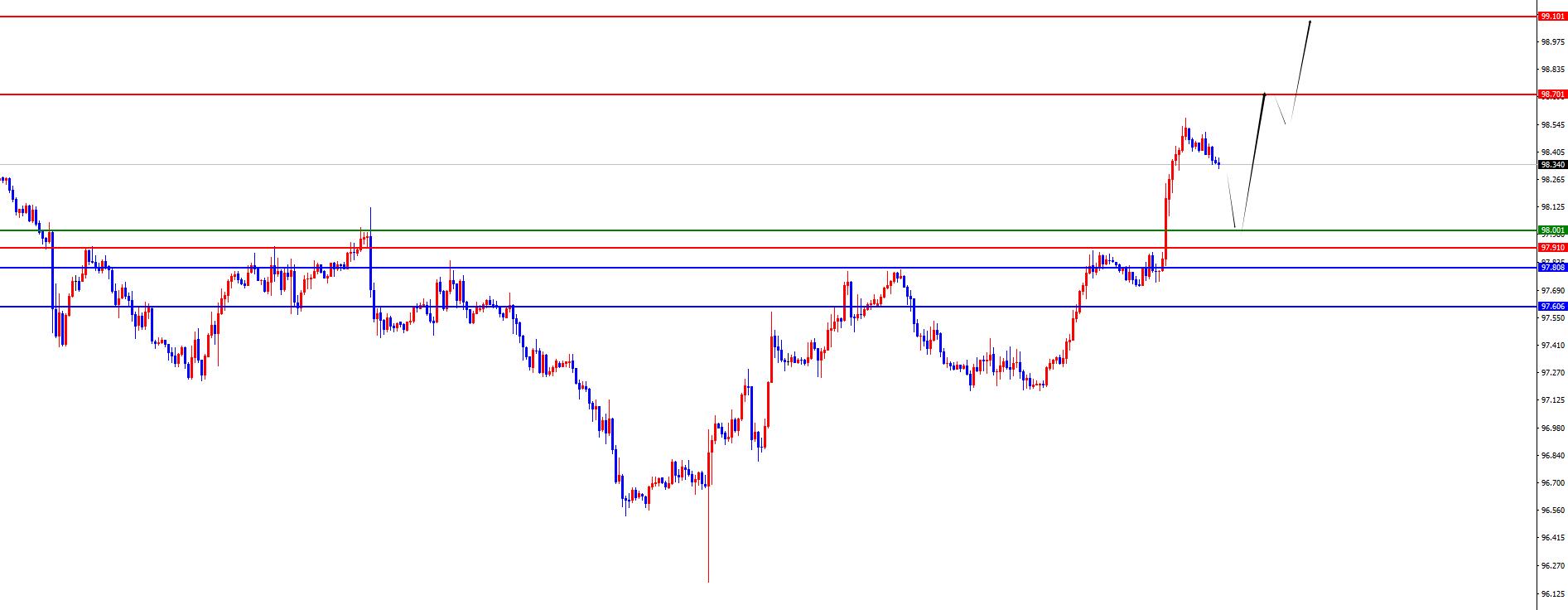 從多周期分析,週線級別來看近期價格在周線關鍵上下盤整,目前週線支撐於97.80區域,同時在昨日價格站上週線阻力,後續只要收盤在此位置之上則中期看多頭延續。從日線級別看,隨著時間的推移目前日線支撐於97.60區域,價格此位置之上波段進一步上漲。從四小時上看,目前看四小時支撐於98位置,後續關注此區域支撐進一步延續上漲。同時一小時上價格短線向下調整,待後續調整至關鍵支撐後再看進一步上漲,上方關注98.70-99.10區域。
