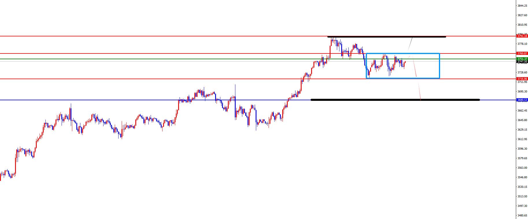 從多周期分析,首先觀察月線節奏,月線上價格8月份大陽收尾,整體看價格依舊多頭運行,從長線上看3000位置是長線走勢的分水嶺,價格在此位置之上長線多對待即可。從周線級別看,價格在周線支撐之上,目前週線多空分水嶺於3445位置,價格在此位置之上中線多對待即可。從日線級別看,暫時需要關注3690區域支撐,此位置之上波段多對待,但是目前需要關注回踩。從四小時上看,週三價格下破四小時阻力,目前四小時阻力於3761位置,價格在此位置之下先看承壓,只有上破才會再度上漲。一小時上看價格目前壓制在下跌趨勢線,同時短線有3717-3761區間震盪,所以在沒有打破區間之前先看震盪,下破下邊緣後關注回踩日線支撐,綜合看目前3761位置為短期分水嶺,在沒有上破前先右側維持空對待,意外上破則關注多頭延續。